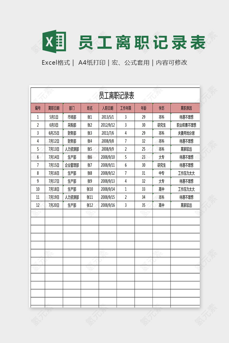 精美大方员工离职记录统计Excel
