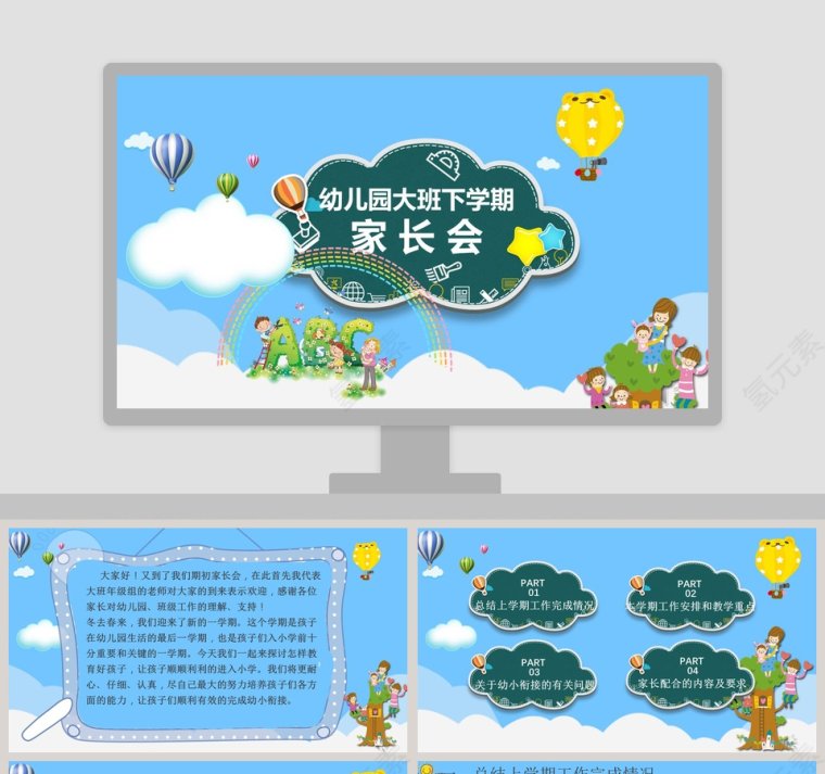 蓝色大气卡通风格幼儿园家长会PPT模板