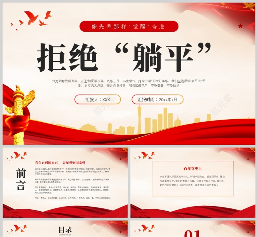 红色党政风像先辈那样“觉醒”奋进拒绝躺平PPT模板